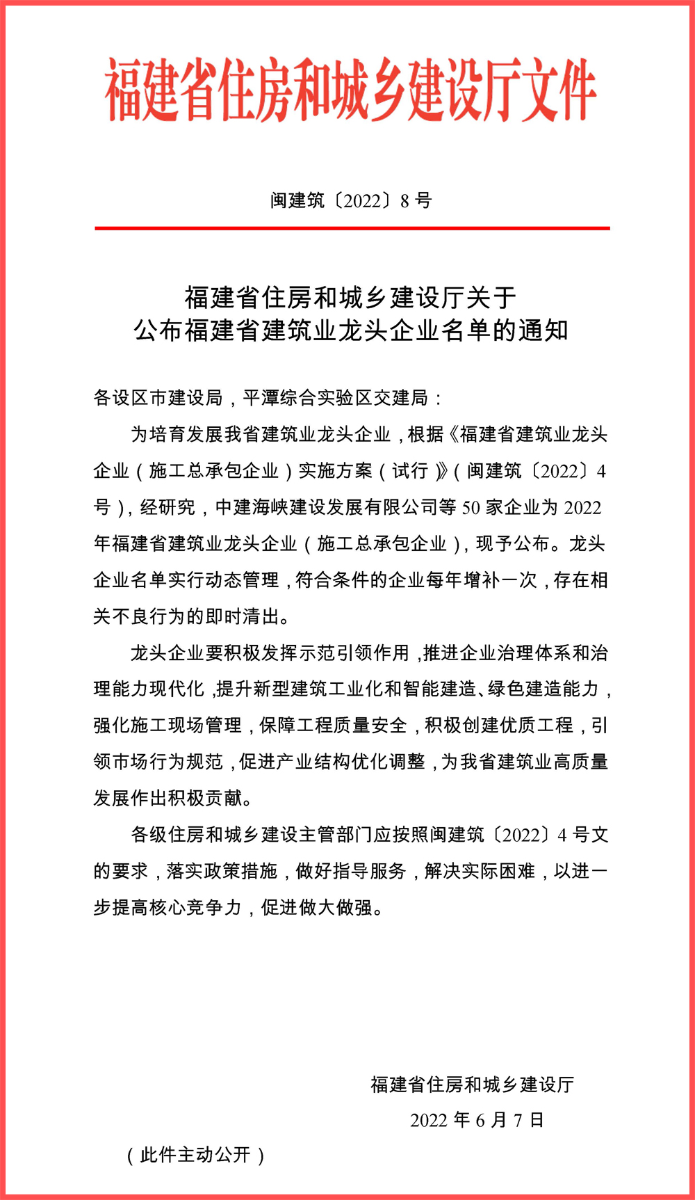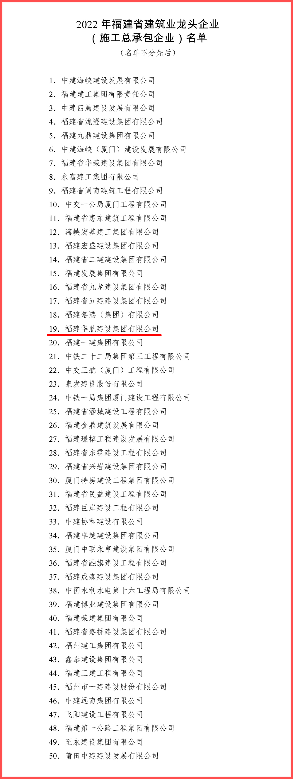 近日,福建省住房和城乡建设厅发布2022年福建省建筑业龙头企业(施工总承包企业)名单,福建华航建设集团等50家企业荣登榜单。获评省级“建筑业龙头企业”,是各级主管部门对企业的高度肯定,也更加坚定福建华航建设集团在更强有力的政策支持下,打造国内先进建筑企业的信心和决心。